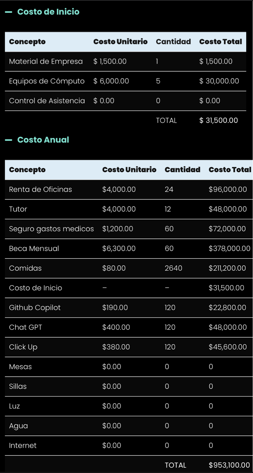 Proyección de Costos de Inicio y Anual.